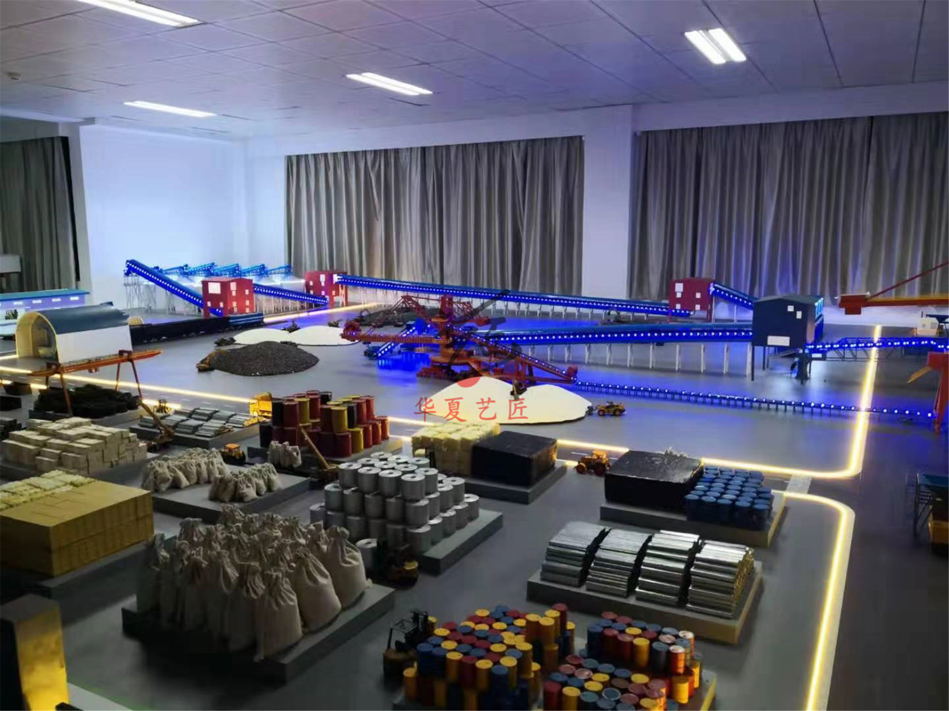 港口物流教學(xué)模型是以青島前灣港港區(qū)為沙盤模型藍(lán)本,融合散糧作業(yè)系統(tǒng),制作成集集裝箱作業(yè)、件雜貨作業(yè)、散糧作業(yè)、煤炭作業(yè)、鐵礦石作業(yè)、油品作業(yè)為一體的多貨種全功能的港口裝卸流程沙盤布局。港區(qū)分為集裝箱碼頭、件雜貨碼頭、固體散貨碼頭、液體化工碼頭四種類型,其中在件雜貨碼頭后方增加散糧筒倉系統(tǒng),